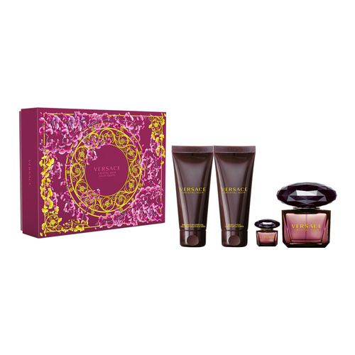 Opis: Versace Crystal Noir zestaw - woda toaletowa 90 ml + woda toaletowa 5 ml + balsam do ciała 100 ml + żel pod prysznic 100 ml